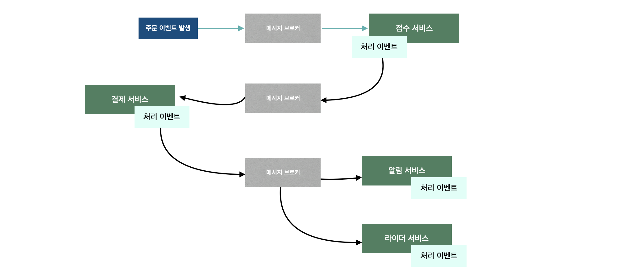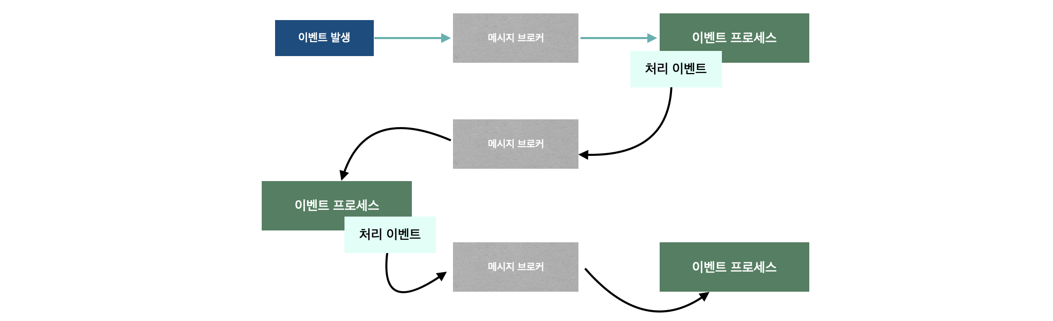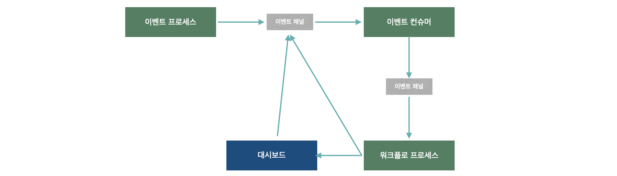 - 다른 이벤트 프로세스 처리 이벤트 메시지 브로커를 구독하고 있다가 이벤트가 들어오면 그에 맞는 작업을 수행한 뒤 새로운 처리 이벤트를 발행합니다.