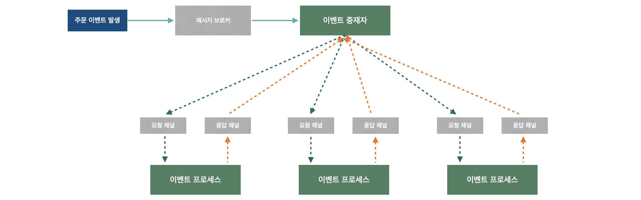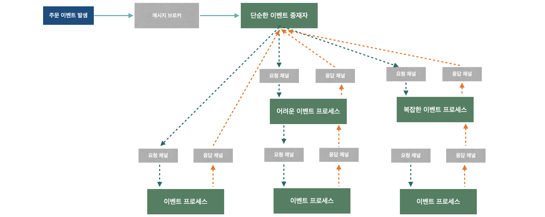- 이벤트 중재자는 이벤트 처리에 관한 단계 정보만 가지고 있으므로 점대점 메시징으로 각각 이벤트 채널로 전달되는 이벤트를 생성합니다.