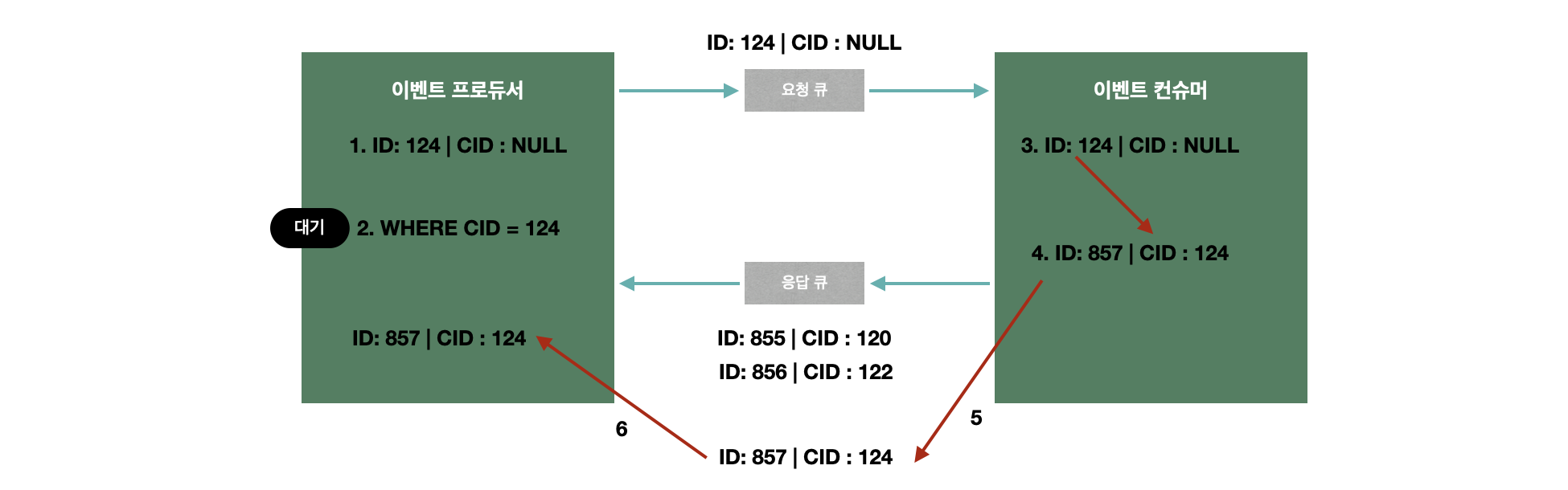 - 이벤트 프로듀서는 메시지 필터로 응답 큐를 차단 대기합니다. 이때 응답 큐에는 상관 ID 124와 일치하는 것이 없으므로 아직까지 대기하게 됩니다.