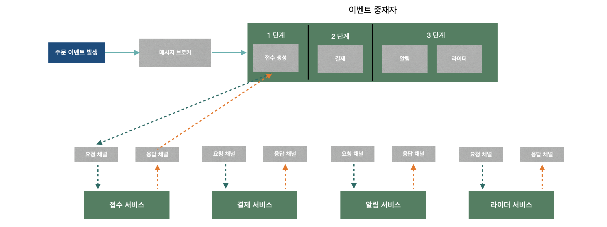 3단계에서는 똑같이 이벤트 중재자가 알림과 라이더 이벤트를 발행하고 각 서비스는 이에 대해 임무를 완료한 뒤 이벤트 중재자에게 응답을 하게됩니다.