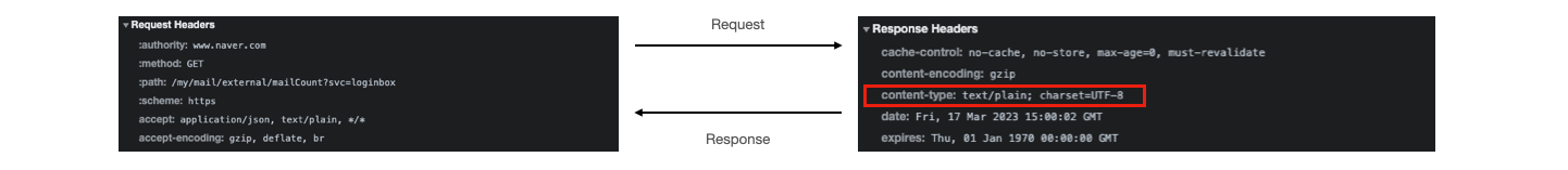 - MIME 타입은 /로 구분되며 주 타입과 부 타입으로 구성됩니다. 예를들어 아래 사진을 보면 content-type: text/plain; charset=UTF-8 을 확인할 수 있습니다.