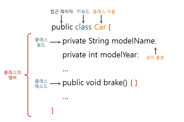 - 클래스는 객체의 상태를 나타내는 필드(field)와 객체의 행동을 나타내는 메서드(method)로 구성됩니다.