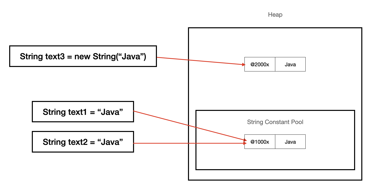 - new 연산자로 생성한 String 객체는 같은 값이 이미 String Constant Pool에 존재하더라도 Heap 영역 내 별도의 객체를 가리키게 됩니다.