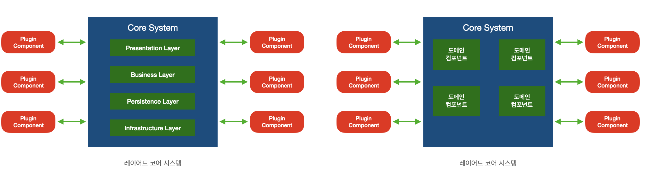 - 플러그인 컴포넌트가 반드시 코어 시스템과 point-to-point 방법으로 통신을 할 필요는 없습니다. 각 플러그인 컴포넌트는 REST나 메시징 등 다른 방법으로 호출하는 방법도 있습니다.