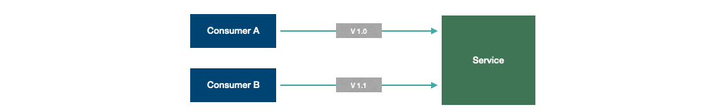 아래 그림에서 소비자 A와 소비자 B가 사용하는 계약은 동일하지만 버전 번호가 다릅니다. 예를 들어 버전 1.0에서는 의사소통 방법이 XML 기반일 수 있지만 버전 1.1에서는 JSON 기반에 요청사항 필드가 추가된 버전입니다. 이때 버전 1.0은 호환성을 유지하기 위해 바로 없앨 수 없습니다. 이는 위에서 설명한 소비자 중심 계약에 대한 개념에 더 가깝습니다.