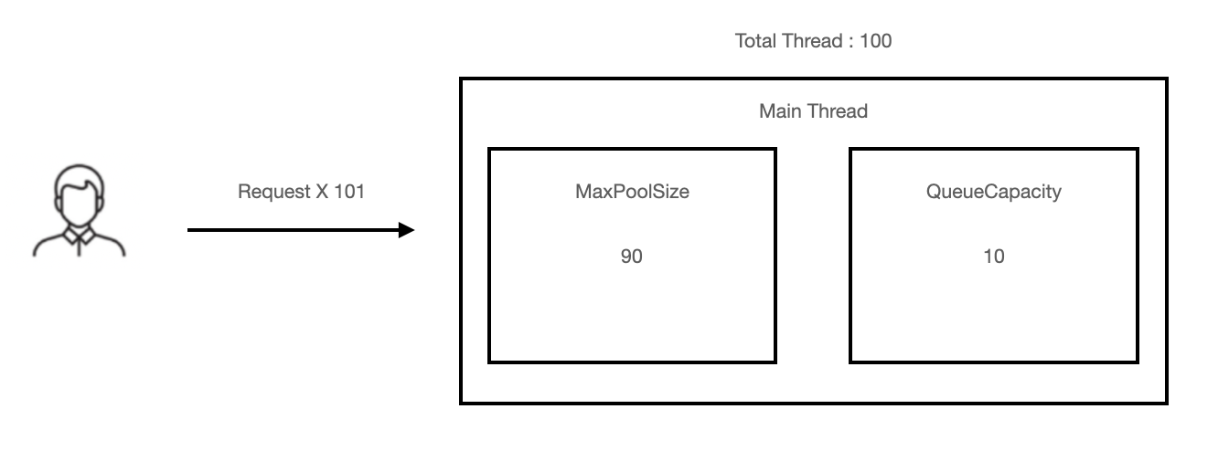 ThreadPoolTaskExecutor를 사용하여 이용가능한 Thread의 숫자가 100개였지만 트레픽이 몰려 101개의 요청이 들어온 상황으로 가정하였습니다.