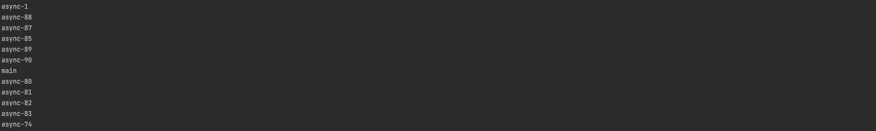 - 실행결과를 보면 setMaxPoolSize로 설정한 90개의 Thread만 사용을하고 setQueueCapacity로 설정한 10개의 Thread는 사용을 하지 않았습니다.